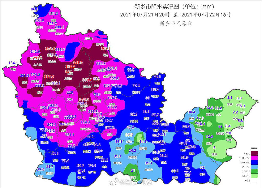 據@新鄉氣象 22日16時許消息,21日20時至22日16時,新鄉市北中部出現大暴雨、特大暴雨,共有19個站點達到特大暴雨(≥250mm)。