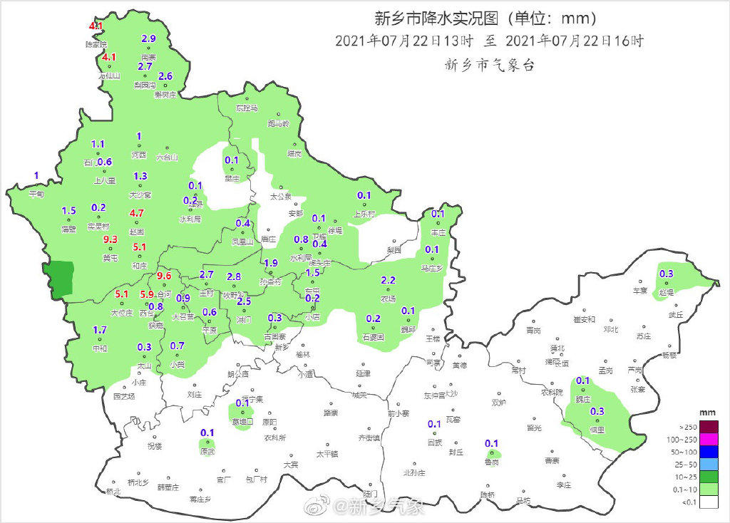 此外,@新鄉氣象 還公佈了22日13至16時3小時累計雨量分佈圖。