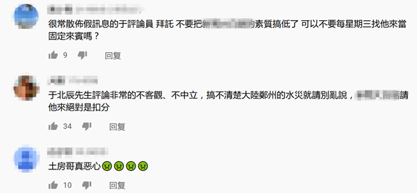 然後他話鋒一轉,點名於北辰就開罵,怒斥其作為公眾人物講話要負責任:“我實在是聽不下去了,於‘將軍’啊,你説大陸沒有報(道),這個是錯的。你現在説話,公眾人物應該要負責任的。因為大陸到處都在報(道),全國人民都知道這個大水真的很大,都在替我們河南的同胞祈福了。請你不要亂講了,付一點責任啦!大陸都知道了,實在受不了你了。”