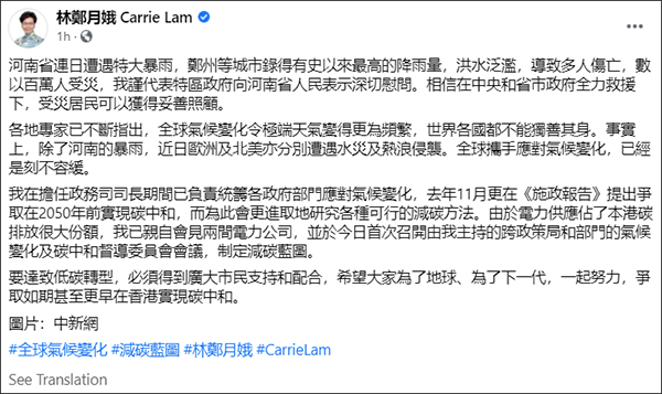 林鄭月娥在社交媒體上稱,河南省連日遭遇特大暴雨,鄭州等城市錄得有史以來最高的降雨量,洪水氾濫,導致多人傷亡,數以百萬人受災,“我謹代表特區政府向河南省人民表示深切慰問。”