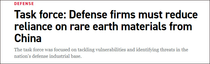 “工作組”稱,大量材料的“唯一供應商是中國”。他們建議出台一項要求,以確定“那些供應和材料來自敵對國家的項目,並實施計劃減少對這些國家依賴。”值得注意的是,這份報告在措辭中直接將中國定性為了“敵對國家”。