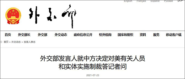 針對美方錯誤行徑,中方決定採取對等反制,根據《反外國制裁法》對前美商務部長羅斯、美國會“美中經濟與安全評估委員會”(USCC)主席卡羅琳·巴塞洛繆、“國會—行政部門中國委員會”(CECC)前辦公室主任喬納森·斯迪沃斯、“美國國際事務民主協會”金度允、“美國國際共和研究所”在港授權代表亞當·金、“人權觀察”中國部主任索菲·理查森及“香港民主委員會”等7個美方人員和實體實施制裁。
