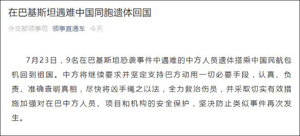 據外交部領事司微信公眾號“領事直通車”今晚(23日)消息,9名在巴基斯坦恐襲事件中遇難的中方人員遺體今天搭乘中國民航包機回到祖國。