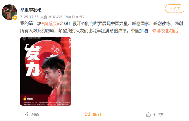 賽後,下午5點33分,@舉重李發彬 發博稱:我的第一塊奧運會金牌!很開心能向世界展現中國力量。感謝國家、感謝教練、感謝所有人對我的幫助。希望我的隊友們也能舉出滿意的成績。