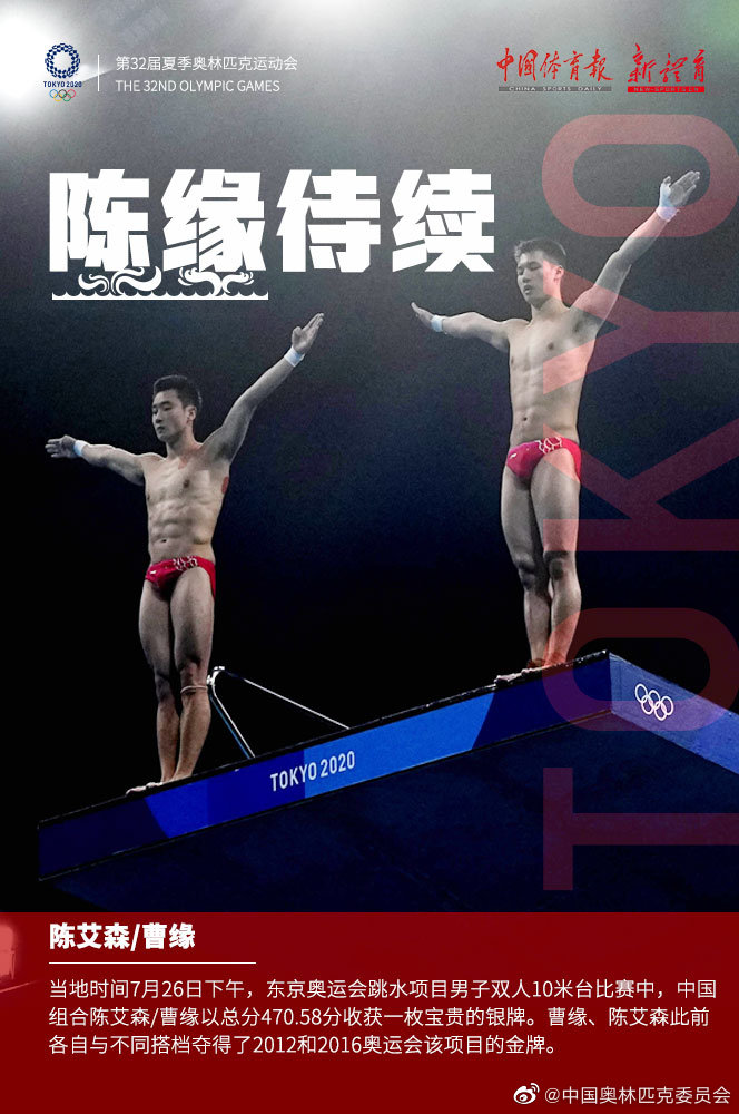 @中國奧林匹克委員會 7月26日消息,當地時間26日下午,東京奧運會跳水項目男子雙人10米台比賽中,中國組合陳艾森/曹緣以總分470.58分收穫一枚寶貴的銀牌。