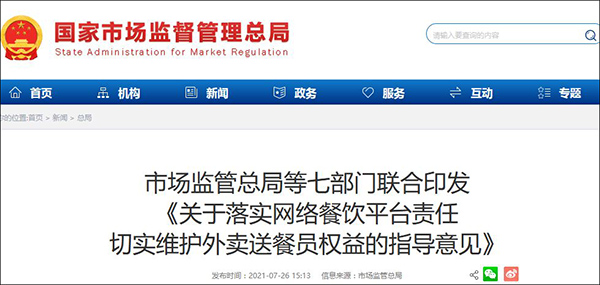 市場監管總局網站7月26日消息,近日,市場監管總局、國家網信辦、國家發展改革委、公安部、人力資源社會保障部、商務部、中華全國總工會聯合印發《關於落實網絡餐飲平台責任 切實維護外賣送餐員權益的指導意見》(以下簡稱《意見》),對保障外賣送餐員正當權益提出全方位要求。