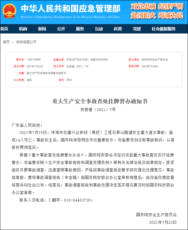據應急管理部官網7月26日消息,國務院安全生產委員會近日發佈《重大生產安全事故查處掛牌督辦通知書》:7月15日,珠海市在建興業快線(南段)工程石景山隧道發生重大透水事故,造成14人死亡。根據《重大事故查處掛牌督辦辦法》,國務院安委會決定對該起重大事故查處實行掛牌督辦。