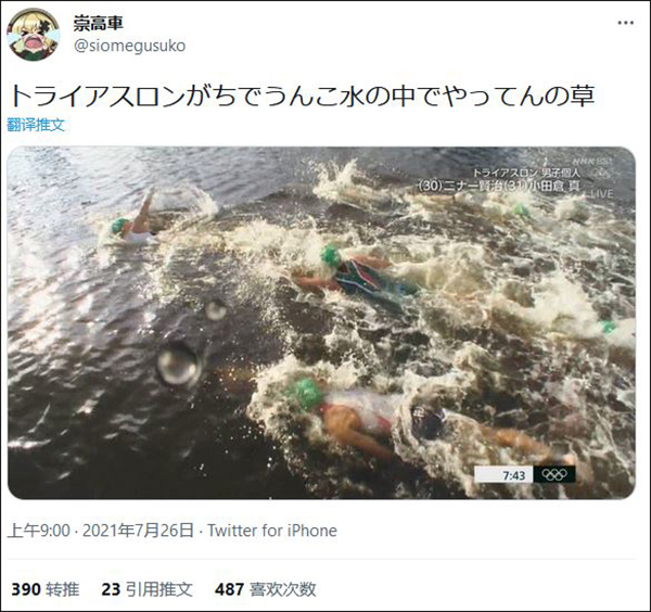 還有日本網友配上了日本NHK電視台的轉播畫面,稱比賽水域為“糞水”。底下有網友回覆稱“選手們真可憐”。