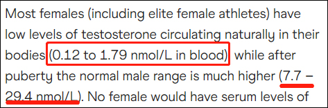 而根據國際田聯的數據,男性青春期後的睾酮水平為每升7.7-29.4納摩爾,女性的睾酮水平一般為每升0.12-1.79納摩爾,同樣低於國際奧委會的“10納摩爾/升”。