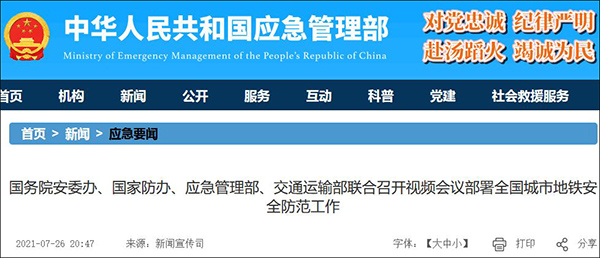 據中國應急管理部網站7月26日晚消息,國務院安委辦、國家防辦、應急管理部、交通運輸部聯合召開全國城市地鐵安全防範專題視頻會議,深入貫徹落實習近平總書記重要指示精神和黨中央、國務院決策部署,對城市地鐵安全防範工作進行再動員再部署再落實。國務院安委會副主任、國家防總副總指揮、應急管理部部長黃明,交通運輸部副部長汪洋出席會議並講話。