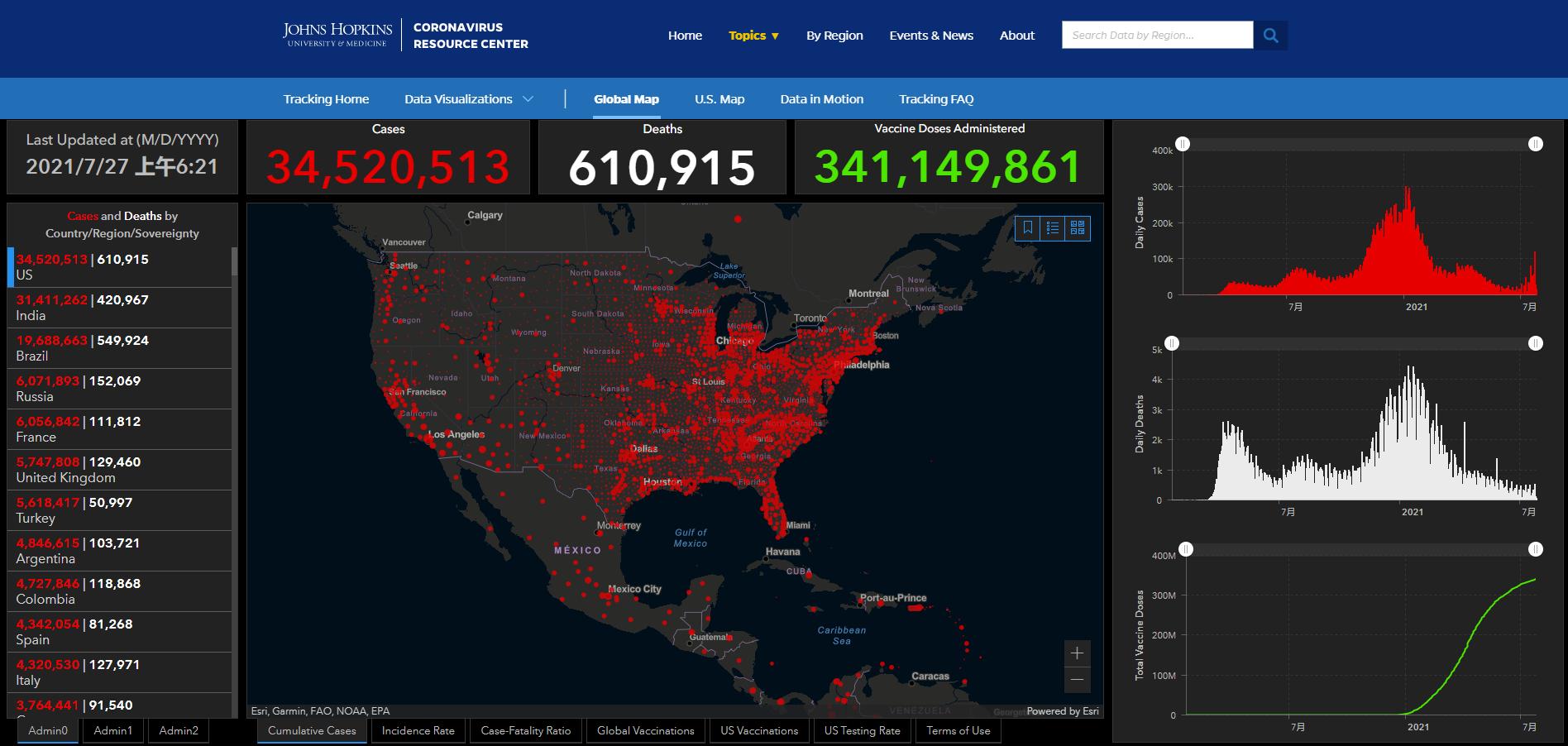 (觀察者網訊)根據美國約翰斯·霍普金斯大學統計數據,截至北京時間2021年7月27日6時21分,美國新冠肺炎累計確診病例34520513例,累計死亡病例610915例。在過去約23小時裏,美國新增確診病例79533例,新增死亡病例28例。