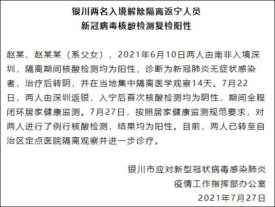 趙某、趙某某(系父女),2021年6月10日兩人由南非入境深圳,隔離期間核酸檢測均為陽性,診斷為新冠肺炎無症狀感染者,治療後轉陰,並在當地集中隔離醫學觀察14天。7月22日,兩人由深圳返銀,入寧後首次核酸檢測均為陰性,期間全程閉環居家健康監測。7月27日,按照居家健康監測規範要求,對兩人進行了例行核酸檢測,結果均為陽性。目前,兩人已轉至自治區定點醫院隔離觀察並進一步診療。