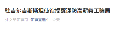 據“領事直通車”微信公眾號7月27日消息,近期,駐吉爾吉斯斯坦使館接到數起在吉爾吉斯斯坦務工人員求助,稱被僱主以口頭承諾高薪騙至吉開採煤礦、金礦等。上述人員來吉後,僱主拒不簽署勞務合同,亦不兑現高薪承諾,使其陷入困難境地,部分人員甚至感染新冠肺炎,健康安全遭受威脅。
