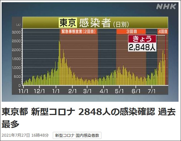 東京都新增2848例確診,創下新冠疫情暴發以來單日新增病例記錄
