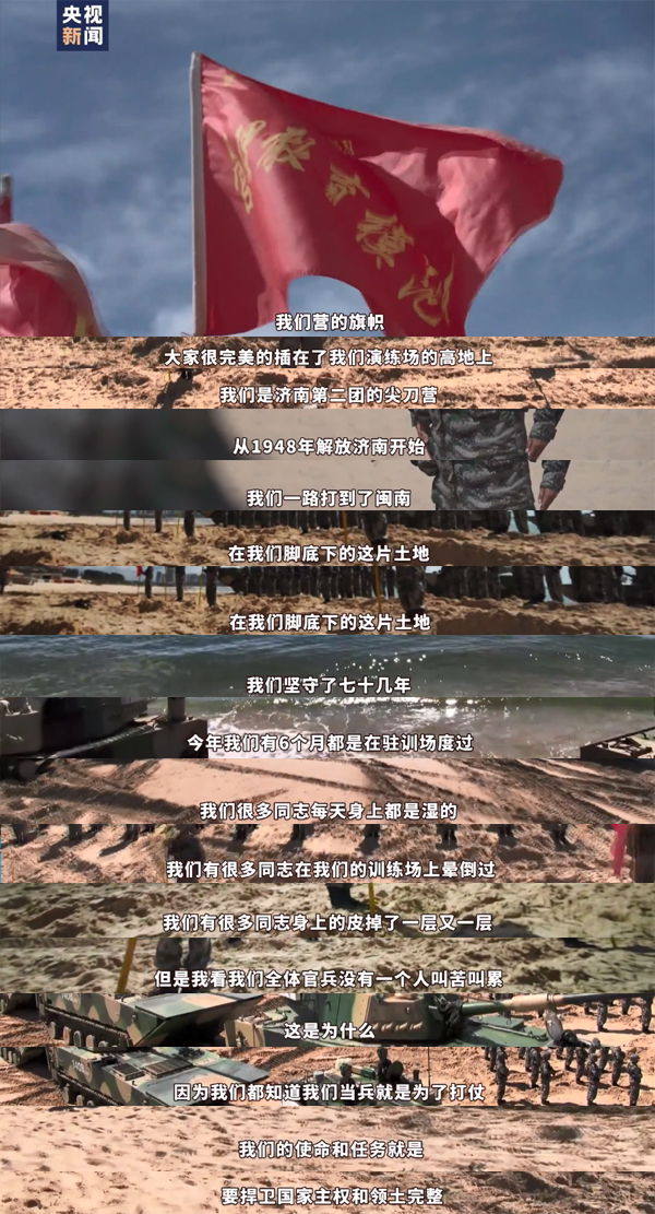 “我們營的旗幟,大家很完美地插在了我們演練場的高地上!我們是濟南第二團的尖刀營。從1948年解放濟南開始,我們一路打到了閩南!在我們腳底下的這片土地上,我們堅守了七十幾年。今年我們有6個月都是在駐訓場度過的,我們很多同志每天身上都是濕的。我們有很多同志在訓練場上暈倒過,我們有很多同志身上的皮掉了一層又一層,但是我看到我們全體官兵沒有一個人叫苦叫累。這是為什麼?因為我們都知道,我們當兵就是為了打仗!我們的使命和任務,就是要捍衞國家主權和領土完整!”