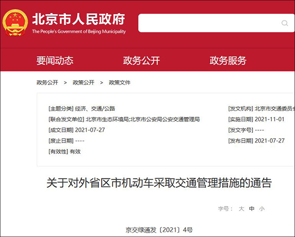北京市人民政府網站7月27日發佈了《關於對外省區市機動車採取交通管理措施的通告》(以下簡稱《通告》)。