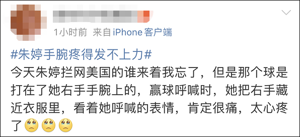 整場比賽中,不少網友都注意到這樣一個細節,朱婷每次扣球,都會摸和甩幾下受傷的右手腕,第三局打到17平的時候,美國隊一記扣球被朱婷攔下,球正中朱婷手腕的繃帶夾板,隨即朱婷發出了一聲大吼,之後又把手腕藏進了衣服裏。