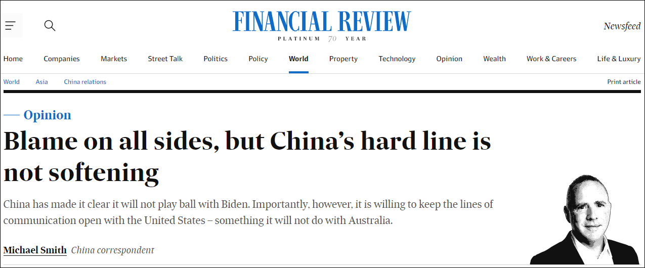 “然而,重要的是,中國願意保持與美溝通渠道的暢通,但這件事情中國不會對澳大利亞做。”該報記者史密斯如此寫道。