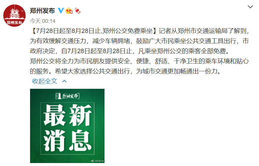 @鄭州發佈 7月28日稱,**為有效緩解交通壓力,減少車輛擁堵,鼓勵廣大市民乘坐公共交通工具出行,市政府決定,自7月28日起至8月28日止,凡乘坐鄭州公交的乘客全部免費。**鄭州公交將全力為市民朋友提供安全、便捷、舒適、乾淨衞生的乘車環境和貼心的服務。希望大家選擇公共交通出行,為城市交通更加暢通出一份力。
