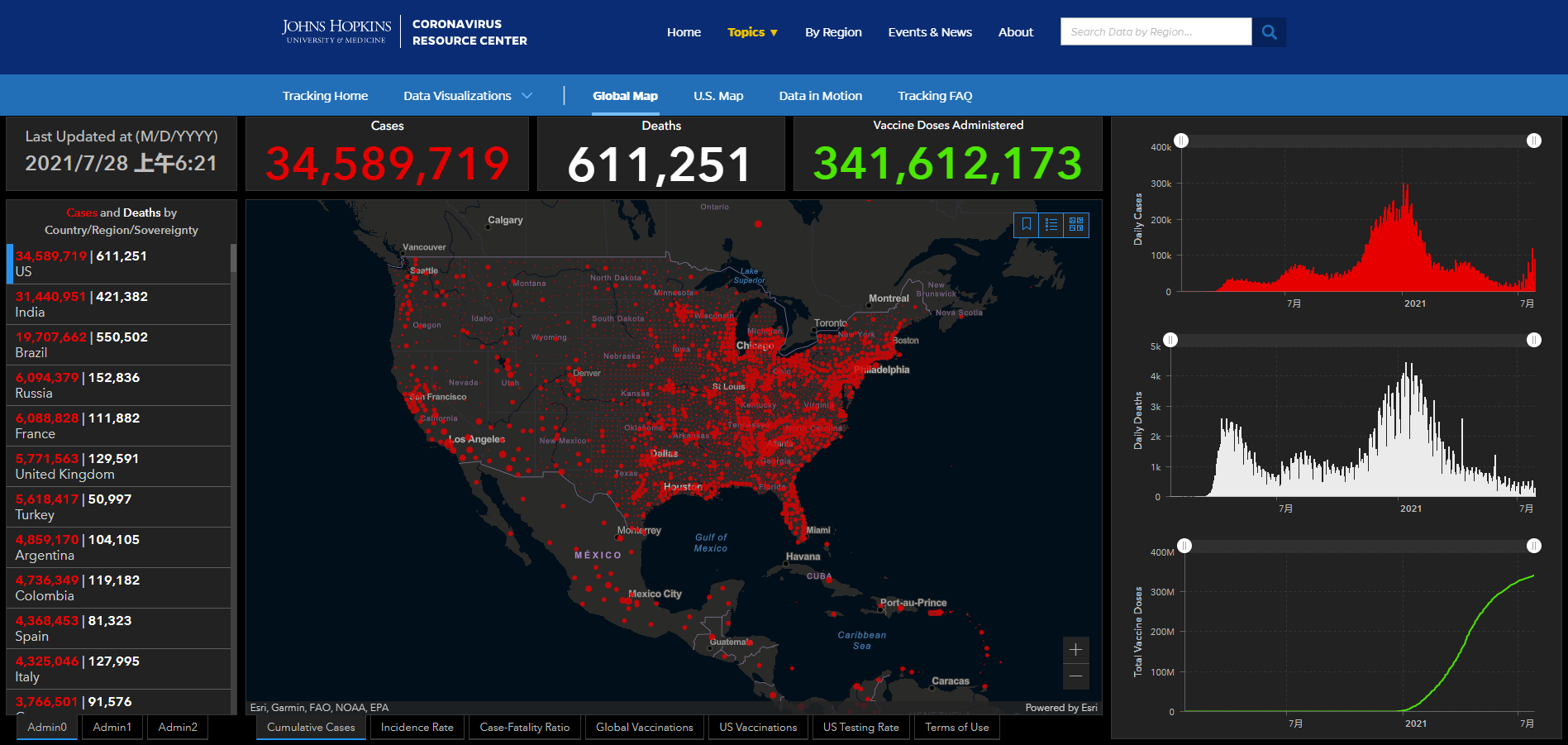 (觀察者網訊)根據美國約翰斯·霍普金斯大學統計數據,截至北京時間2021年7月28日6時21分,美國新冠肺炎累計確診病例34589719例,累計死亡病例611251例。在過去約24小時裏,美國新增確診病例69206例,新增死亡病例336例。