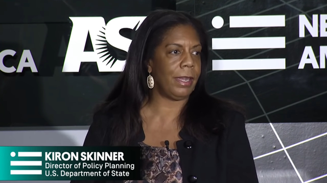 2019年4月29日,時任美國國務院政策規劃主任斯金納(Kiron Skinner)在華盛頓“2019未來安全論壇”上稱,美國與中國是“一種完全不同的文明和不同意識形態之間的鬥爭” 視頻截圖