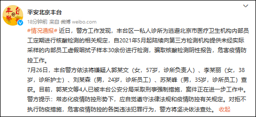 北京豐台警方:一私人診所騙取核酸檢測陰性報告危害疫情防控,4人被採取刑事強制措施