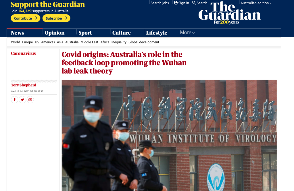 《衞報》澳大利亞版刊文《新冠溯源:澳大利亞在推動武漢實驗室泄漏論中扮演了什麼角色》,揭露澳大利亞記者沙麗·馬克森與美國右翼勢力聯手炒作新冠病毒“實驗室泄漏論”的相關內幕。(網頁截屏)