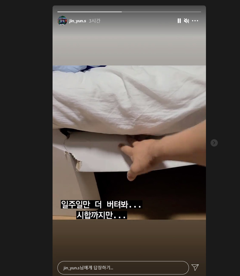 27日,他在個人社媒instagram上發佈了一個ins story,曬出了自己在奧運村睡的牀。那畫面,真是“悽悽慘慘慼戚”,一八尺肌肉男連張完好的牀都睡不上: