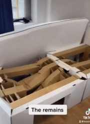 宣稱運用了各類高科技和新穎設計,能承受200公斤重量的紙板牀竟然裂了,牀板和牀腿的連接處整個斷開。陳潤成在視頻上配的文案也顯得對此境況非常無奈:“再堅持一週吧……”