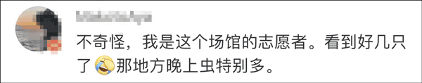 有自稱在該場館當志願者的網友評論稱,“看到好幾只了,那地方晚上蟲特別多”。