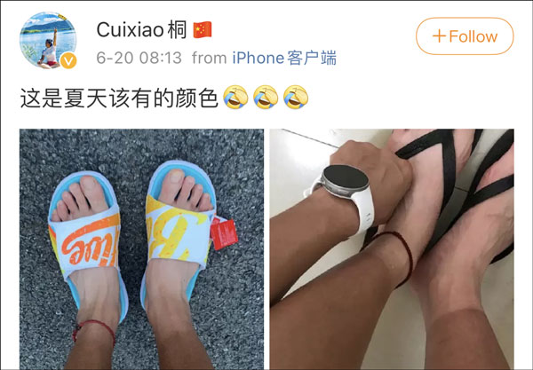 今年6月,崔曉彤曾在微博發過訓練後的膚色對比照,賽艇運動員的夏天是什麼顏色,就是腿和腳不是一個顏色。