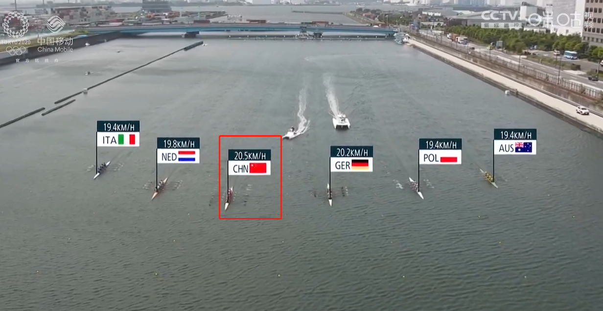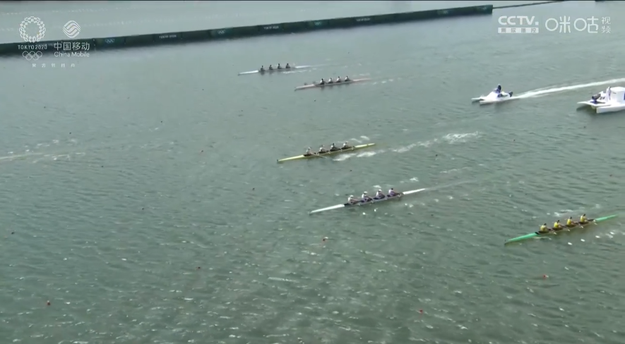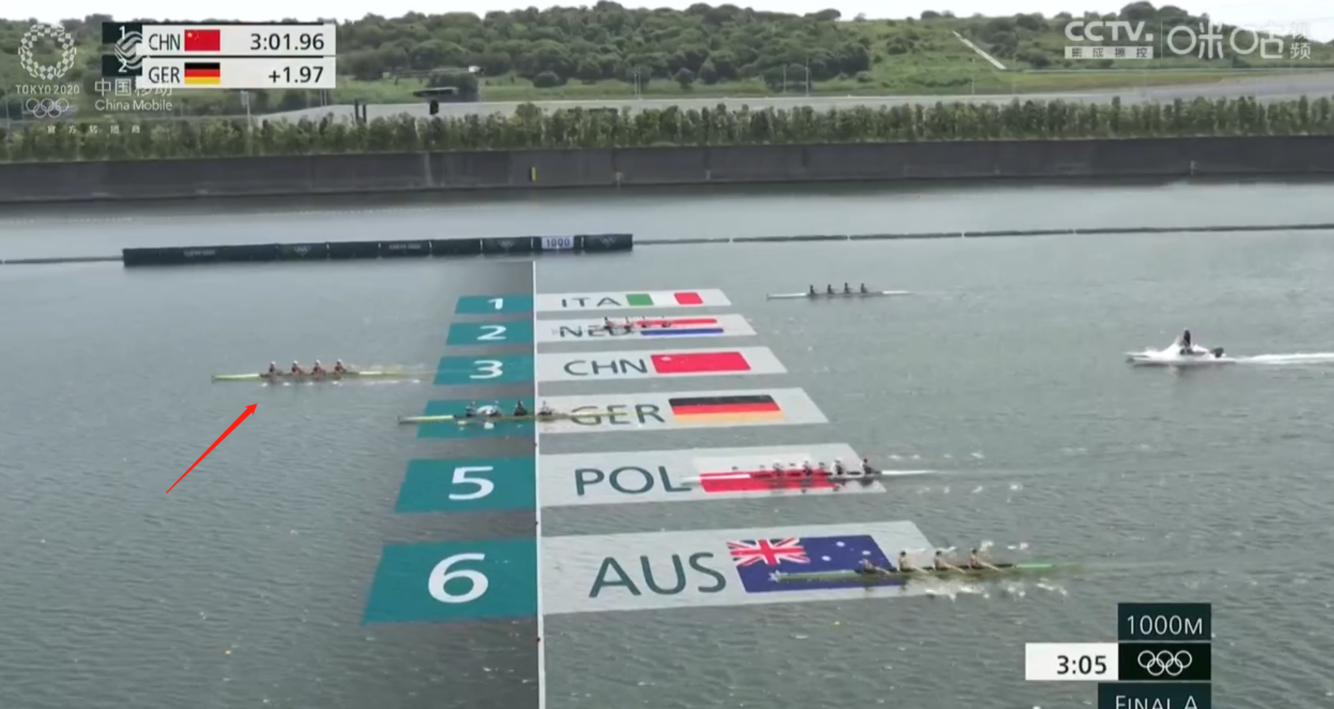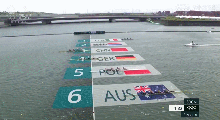 到了最後500米衝刺區,中國姑娘們進一步甩開距離,領先第二名兩個半艇位。直播畫面中,出現了拍中國隊就沒其他隊,拍其他隊就不見第一名的情況。
