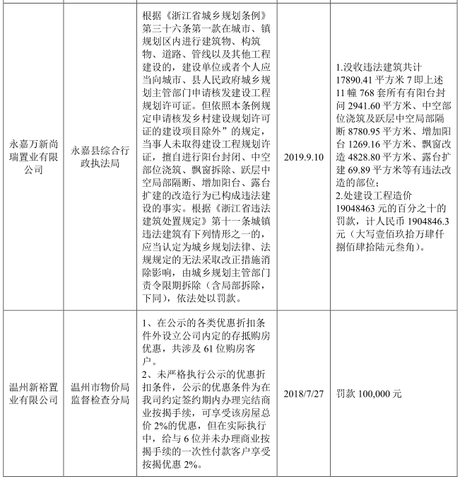 最為嚴重的一次是旗下一級子公司永嘉萬新尚瑞置業有限公司,2014年因涉嫌非法侵佔國有土地1742平方米並新建建築物和其他設施,未能如期退還,被浙江省永嘉縣人民法院列為“失信被執行人”,強制沒收其在非法佔用土地上新建的建築物和其他設施。