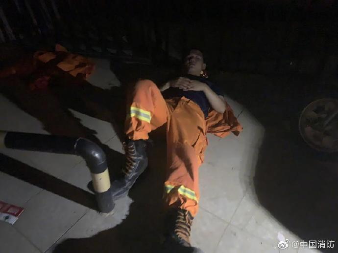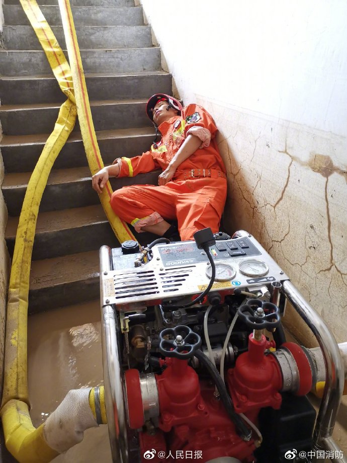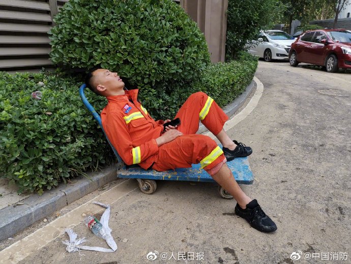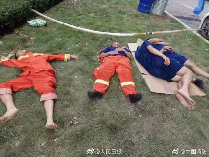 在社交媒體上,消防員們累癱的照片多次刷屏,有消防救援人員在一天的緊張救援後,隨手在路邊撿了一塊紙板便“席地而睡”,讓人淚目。
