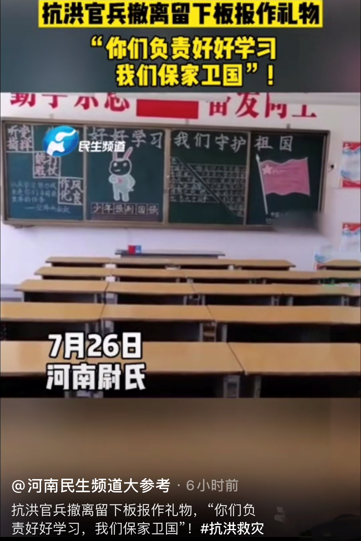26日,河南開封尉氏縣,抗洪官兵離開駐紮地韓莊小學時,在教室黑板上留下板報,上面寫着“你們負責好好學習,我們保家衞國”等字樣。