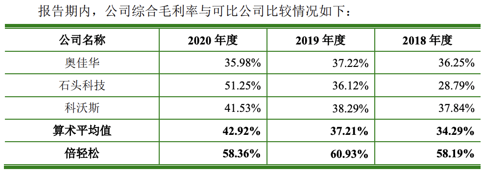 2020年,與大型按摩器具企業奧佳華、榮泰健康35.98%、28.70%的綜合毛利率相比,倍輕鬆優勢超過20個百分點。