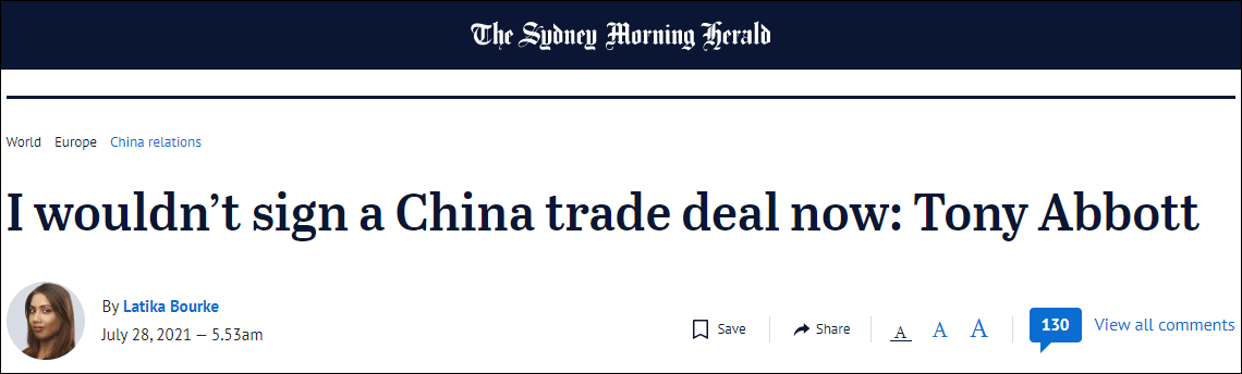 阿博特聲稱,如果換做是現在,他絕對不會與中國簽署貿易協議,澳大利亞當初“一廂情願地認為”(wishful thinking),隨着全球經濟一體化進程的加深,中國人會變得“更像我們一樣”。他宣稱,中方當時在“政治層面”的承諾已被證明是“空洞的”。