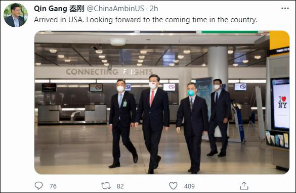 秦剛發佈了到任後第一條推特:已抵達美國,期待在這個國家接下來的時光。