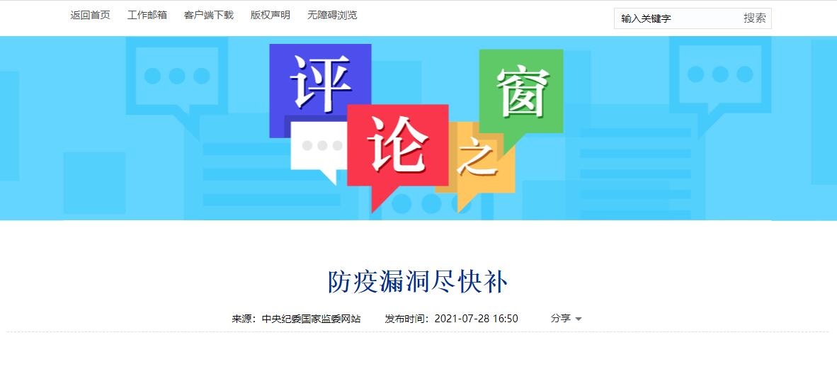 7月28日,中央紀委國家監委網站評論文章《防疫漏洞儘快補》指出,在境外疫情形勢依舊不容樂觀的情況下,祿口機場存在監管缺位、管理不專業等問題,疫情防控的各項措施沒有落細落實。不僅引發此輪疫情的地方單位要全面排查、深刻反思、落實整改,其他地方,特別是國際機場、邊境區域等,也要舉一反三、汲取教訓、查漏補缺。