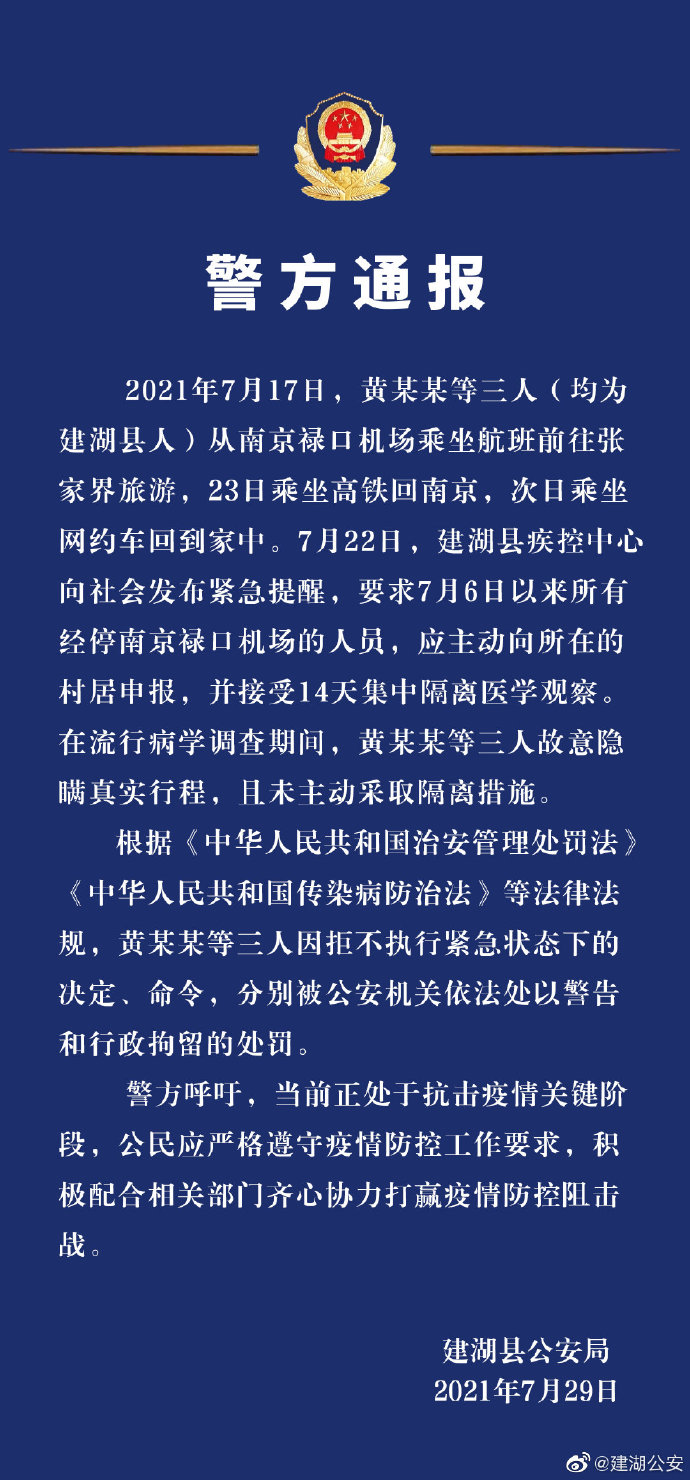 江蘇建湖警方:三人前往張家界旅遊後故意隱瞞真實行程且未主動隔離被處罰