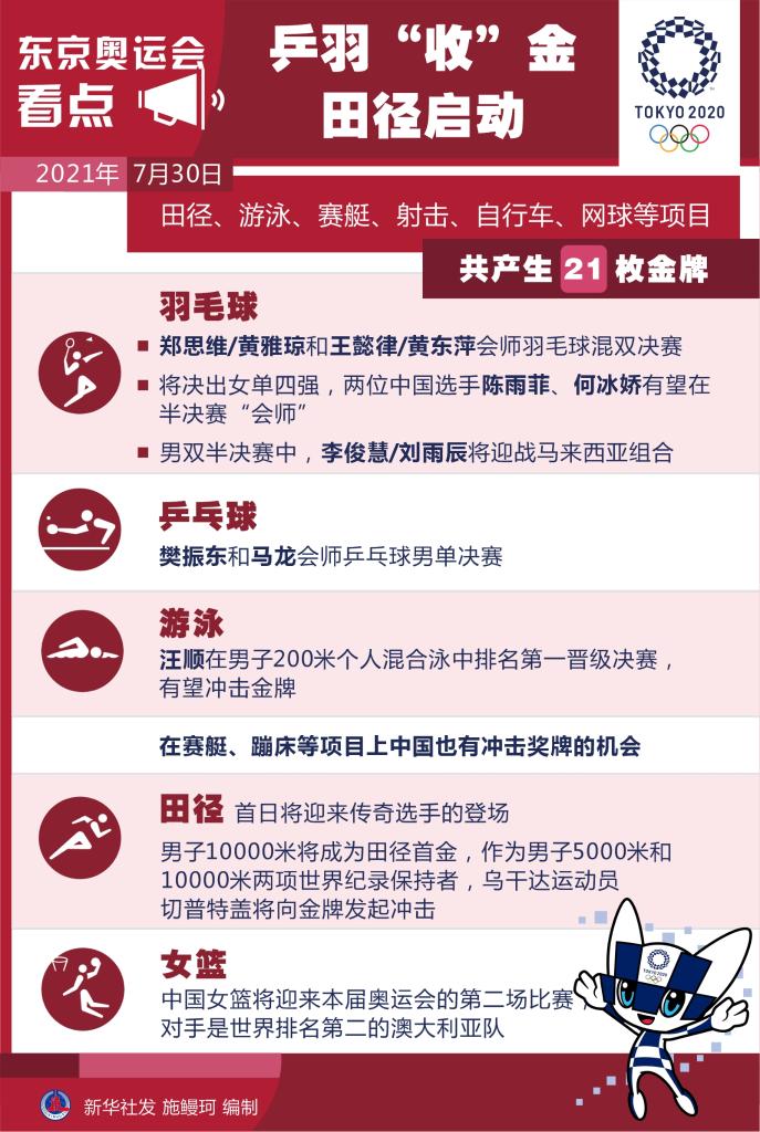 30日田徑、游泳、賽艇、射擊、自行車、網球等項目共產生21枚金牌,併產生女足四強。中國女籃30日將迎來本屆奧運會的第二場比賽,對手是世界排名第二的澳大利亞隊。羽毛球項目將決出女單四強,兩位中國選手陳雨菲、何冰嬌有望在半決賽“會師”,男雙半決賽中,李俊慧/劉雨辰將迎戰馬來西亞組合。