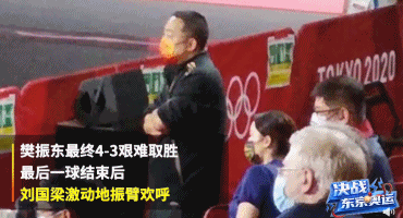 第一場,樊振東對陣中國台灣的林昀儒,比賽過程十分膠着,劉國樑現場督戰,多次站起歡呼。