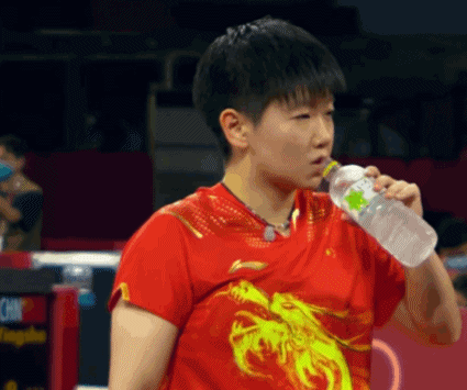 同樣是喝水,陳夢老成地端起保温杯;而年紀小得多的孫穎莎貪涼,灌的幾瓶水都是冰的。