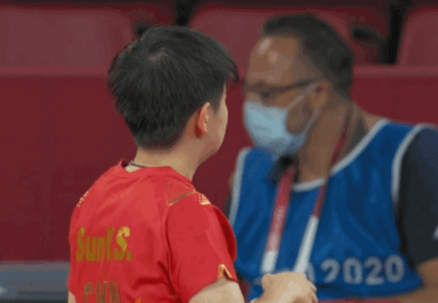 比賽中,孫穎莎先喊了個暫停,然後跑到邊上一邊喝水一邊碎碎念,仔細一看竟然是他在給自己講戰術,一人分飾“教練”“運動員”兩角。