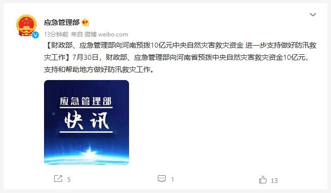 財政部、應急管理部向河南預撥救災資金10億元 None 2021-07-30 據@應急管理部 消息,7月30日,財政部、應急管理部向河南省預撥中央自然災害救災資金10億元,支持和幫助地方做好防汛救災工作。