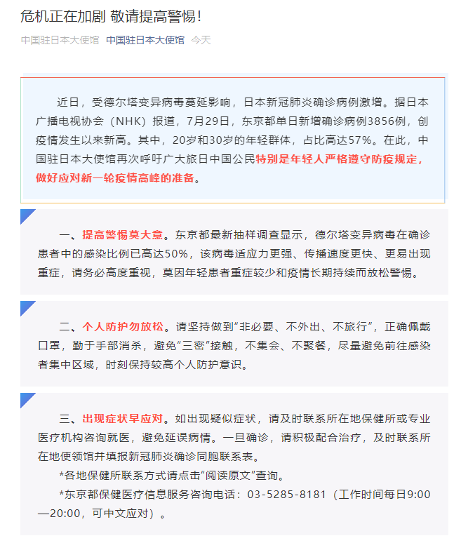 日本確診病例激增,駐日使館提醒旅日中國公民做好應對新一輪疫情高峯準備