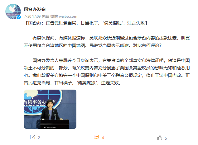 據@國台辦發佈 微博7月30日消息,有媒體提問,有媒體報道稱,美聯邦眾院近期通過包含涉台內容的撥款法案,叫囂不使用包含台灣地區的中國地圖。民進黨當局表示感謝。對此有何評論?