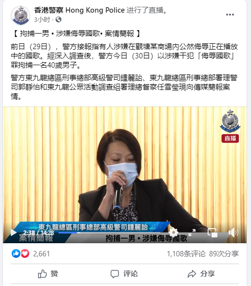 (觀察者網訊)7月30日,香港警方於其官方Facebook賬號上發文表示,香港警方接報稱,有人涉嫌在香港觀塘區某商場內公然侮辱正在播放中的國歌。經深入調查,警方今日(30日)以涉嫌違反“侮辱國歌”罪拘捕一名40歲男子,這是香港首次有人因為違反《國歌條例》被捕。