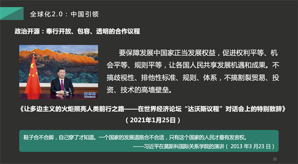 我認為,**全球化2.0將會由中國引領,中國當前倡導的人類命運共同體作為一種全新的國際秩序,正是開源精神向全球治理的延伸。**針對全球化1.0的三個排他性,全球化2.0實現了三個開源。首先是政治開源,中國一直以來推行開放、包容、透明的政治議程,尊重政治制度的多元化。正如習近平總書記所説,鞋子合不合腳,自己穿了才知道。一個國家的發展道路合不合適,只有自己的人民最有發言權。其次是經濟開源,我們一直在試圖突破全球化1.0中封閉、排他的國際金融體系,我們搞的一帶一路、亞投行,都對被全球化1.0排除在外的發展中國家敞開大門,將他們融入到全球化2.0的發展道路上來。今年1月,總書記在達沃斯論壇發表了題為《讓多邊主義的火炬照亮人類前行之路》的演講,強調要保障發展中國家正當發展權益,促進權利平等、機會平等、規則平等,讓各國人民共享發展機遇和成果,不搞歧視性、排他性標準、規則、體系,不搞割裂貿易、投資、技術的高牆壁壘。這就是一種政治經濟中的開源理念。