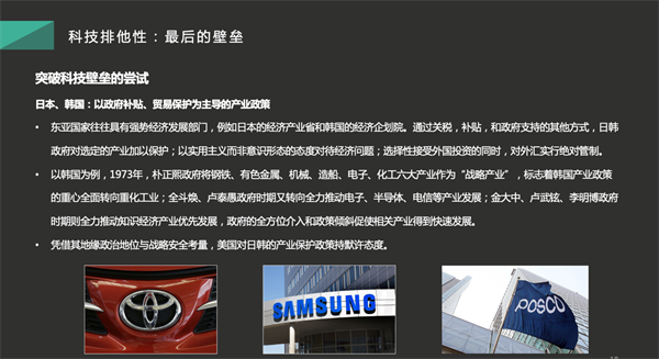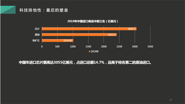 而最後一個就是科技排他性,這是我們最近才意識到的,因為我們被“卡脖子”了。中國的芯片進口數據讓我大吃一驚,竟然比原油、鐵礦石都大。而芯片的毛利率要比原油、鐵礦石大得多,並且説什麼時候卡脖子就什麼時候卡脖子,毫無辦法。科技排他性可以説是實現中華民族偉大復興道路上要攻克的最後的堡壘,不突破這個排他性,我們的偉大復興也難以實現。